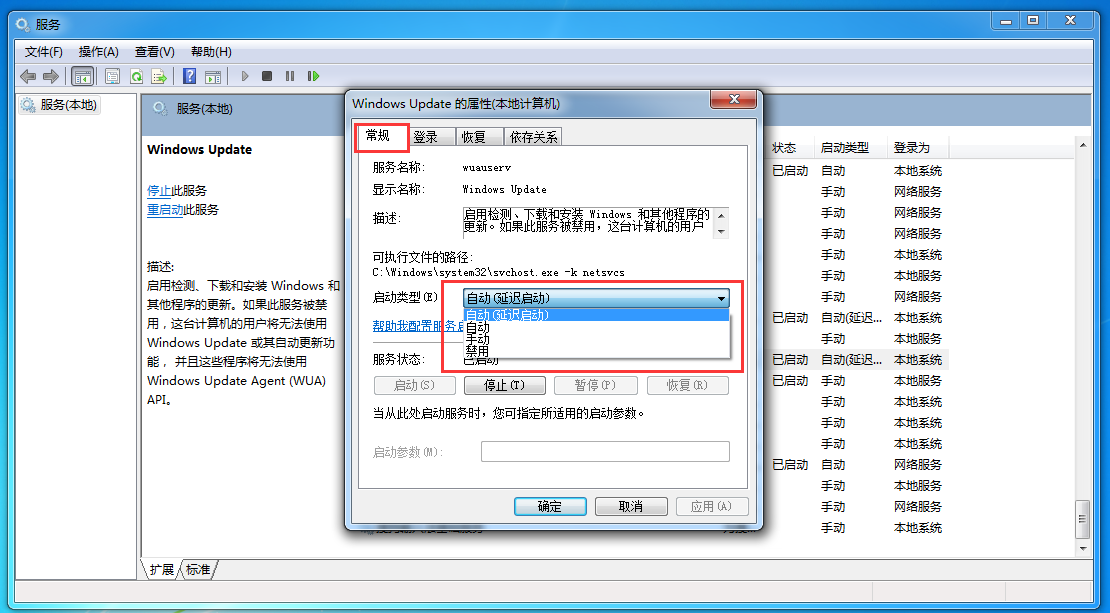 3、双击打开【windows update】属性菜单,在第一个【常规】标签页中部,【启动类型】中进行修改: