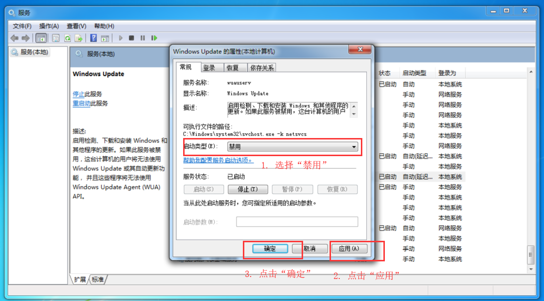 4、【启动类型】改成【禁用】,然后点击【应用】和【确定】,这样就将windows的更新关闭了。