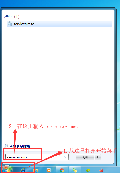 1、正常进入了windows系统之后,要关闭windows更新。由于安全模式下控制面板的菜单也要少很多,所以,我没有通过控制面板找到菜单操作,而是按照下面的步骤进行的。首先点开【开始】菜单,在输入命令的提示框里输入【services.msc】,回车进入: